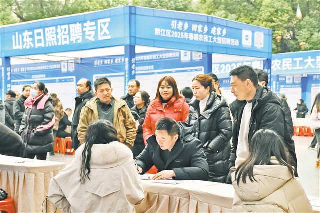 当天,黔江区举行“引老乡、回家乡、建家乡——春暖农民工”大型招聘活动,通过“线上+线下”方式帮助企业招聘优秀人才。来自山东、江苏、四川、湖北等省以及重庆主城等地的共计200多家企业现场招聘,提供就业岗位3000多个。