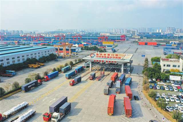 春日的重庆国际物流枢纽园区,集装箱往来如梭,班列汽笛长鸣,一派繁忙有序的开放景象。