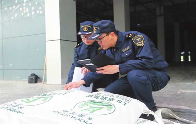 海关人员在东盟木薯粉集散中心检查货物