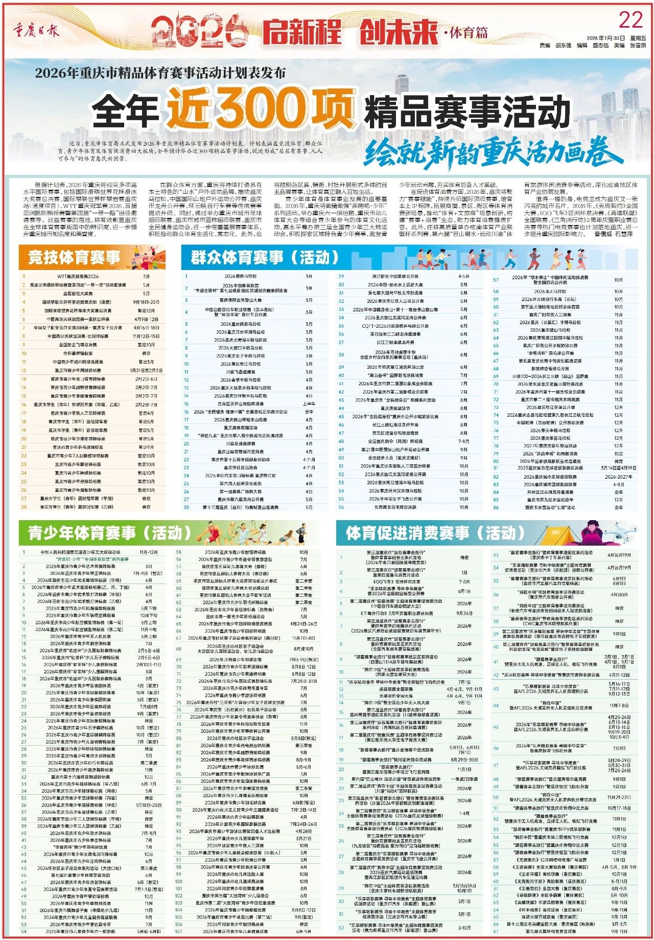 近日,重庆市体育局正式发布2026年重庆市精品体育赛事活动计划表。计划表涵盖竞技体育、群众体育、青少年体育体育促消费四大板块,全年预计举办近300项精品赛事活动,促进形成“层层有赛事、人人可参与”的体育惠民新图景。