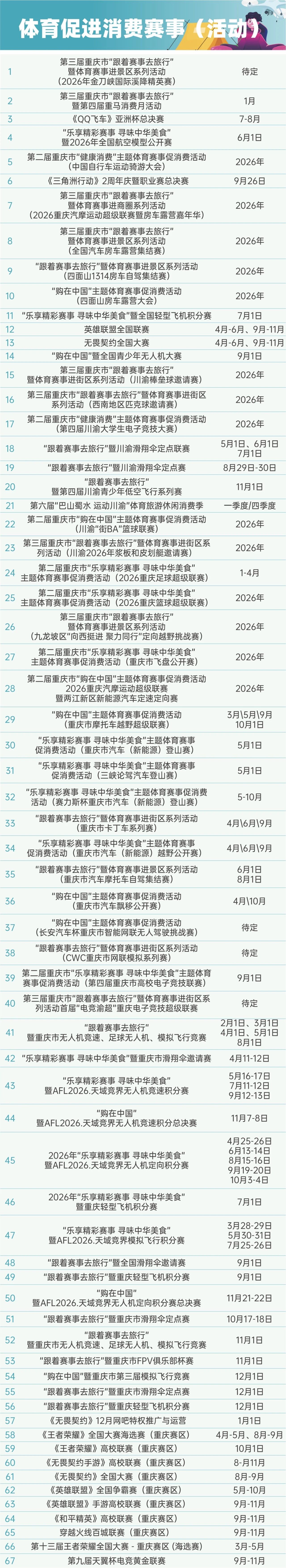 在促进体育消费方面,2026年,重庆将聚力“赛事赋能”,持续升级国际顶级赛事、培育本土IP矩阵,拓展商圈、景区、街区等体育消费新场景,推动“体育+文旅商”场景创新,构建“赛事+消费”生态,助力体育消费提质扩容。此外,还将高质量举办成渝体育产业联盟杯系列赛、第六届“巴山蜀水·运动川渝”体育旅游休闲消费季等活动,深化成渝地区体育产业协同发展。