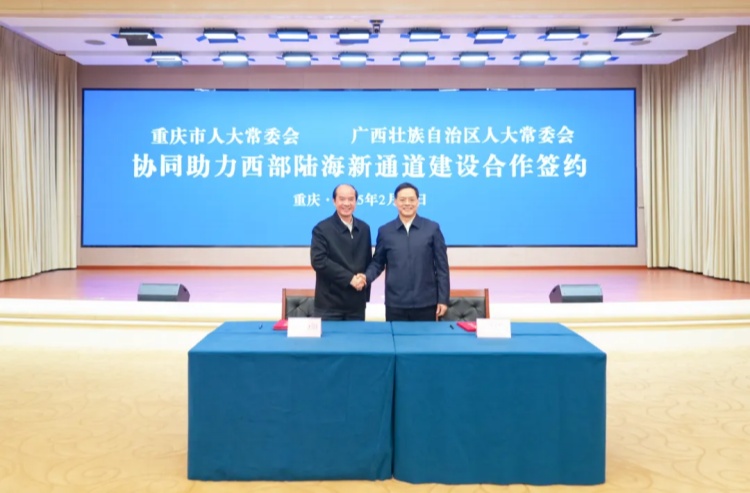 2月26日,重庆市人大常委会和广西壮族自治区人大常委会在重庆签订合作协议,协同助力西部陆海新通道建设。