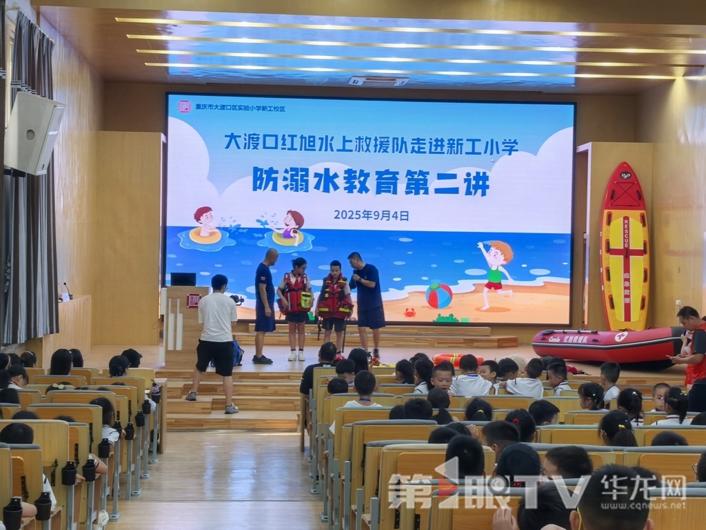 “遇到有人溺水,先大声呼救,切勿盲目下水……”在重庆大渡口区九宫庙街道大渡口实验小学新工校区,红旭水上救援队队员结合案例讲解溺水救援知识,示范自救与施救方法,学生和家长积极参与。