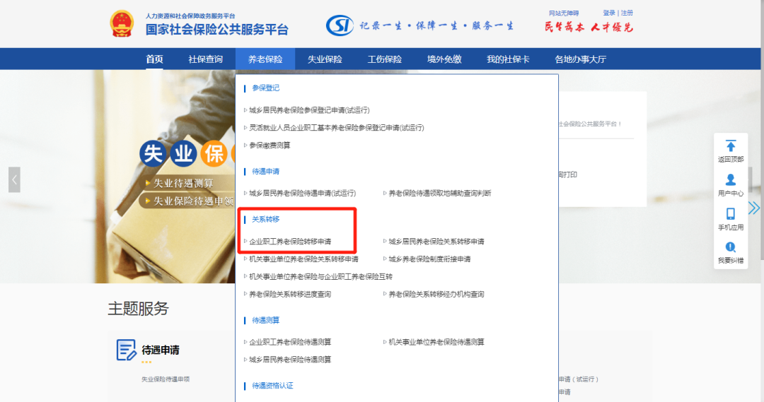 参保人可登录国家社会保险公共服务平台(点击文末“阅读原文”进入),在首页导航栏选择“养老保险”选项后,在下拉菜单中点击“企业职工养老保险转移申请”,进入专题页面,填写本人基本信息和转移信息后即可提交申请。