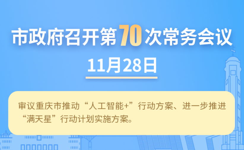 2025年 11月 28日11月28日,市委副书记、市长胡衡华主持召开市政府第70次常务会议,审议重庆市推动“人工智能+”行动方案、进一步推进“满天星”行动计划实施方案。