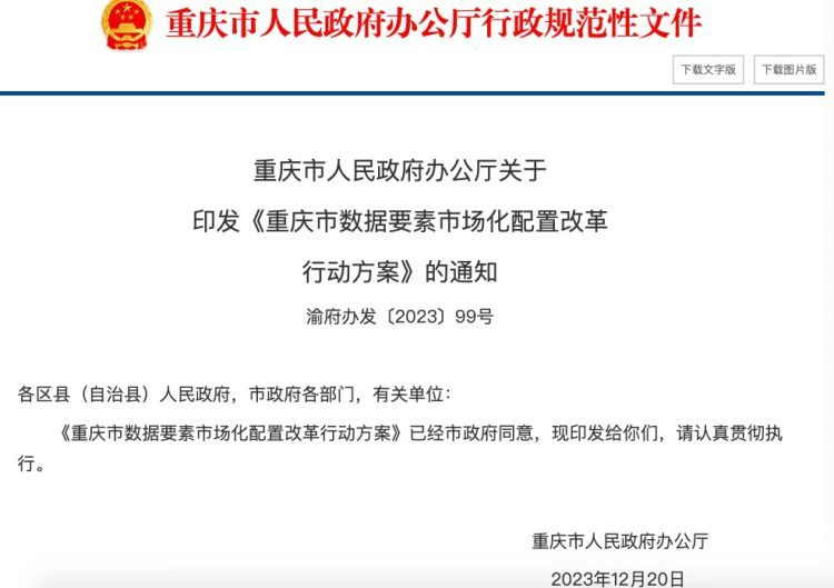 12月28日,重庆市人民政府办公厅发布《重庆市数据要素市场化配置改革行动方案》(以下简称《方案》)。