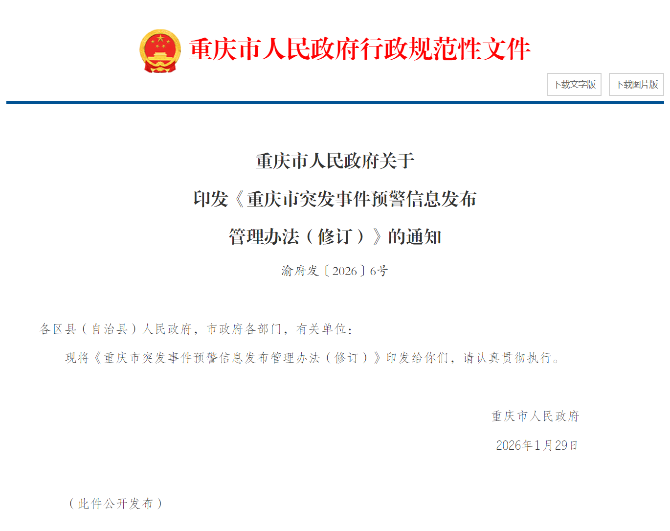 2月3日,市政府公布《重庆市突发事件预警信息发布管理办法(修订)》,预警信息的预警级别按照突发事件发生的紧急程度、发展态势和可能造成的危害程度分为一级、二级、三级和四级,分别用红色、橙色、黄色和蓝色标示,一级为最高级别。《办法》自发布之日起施行。