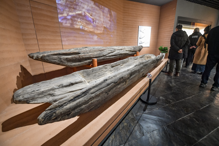 游客参观展厅船棺展品。