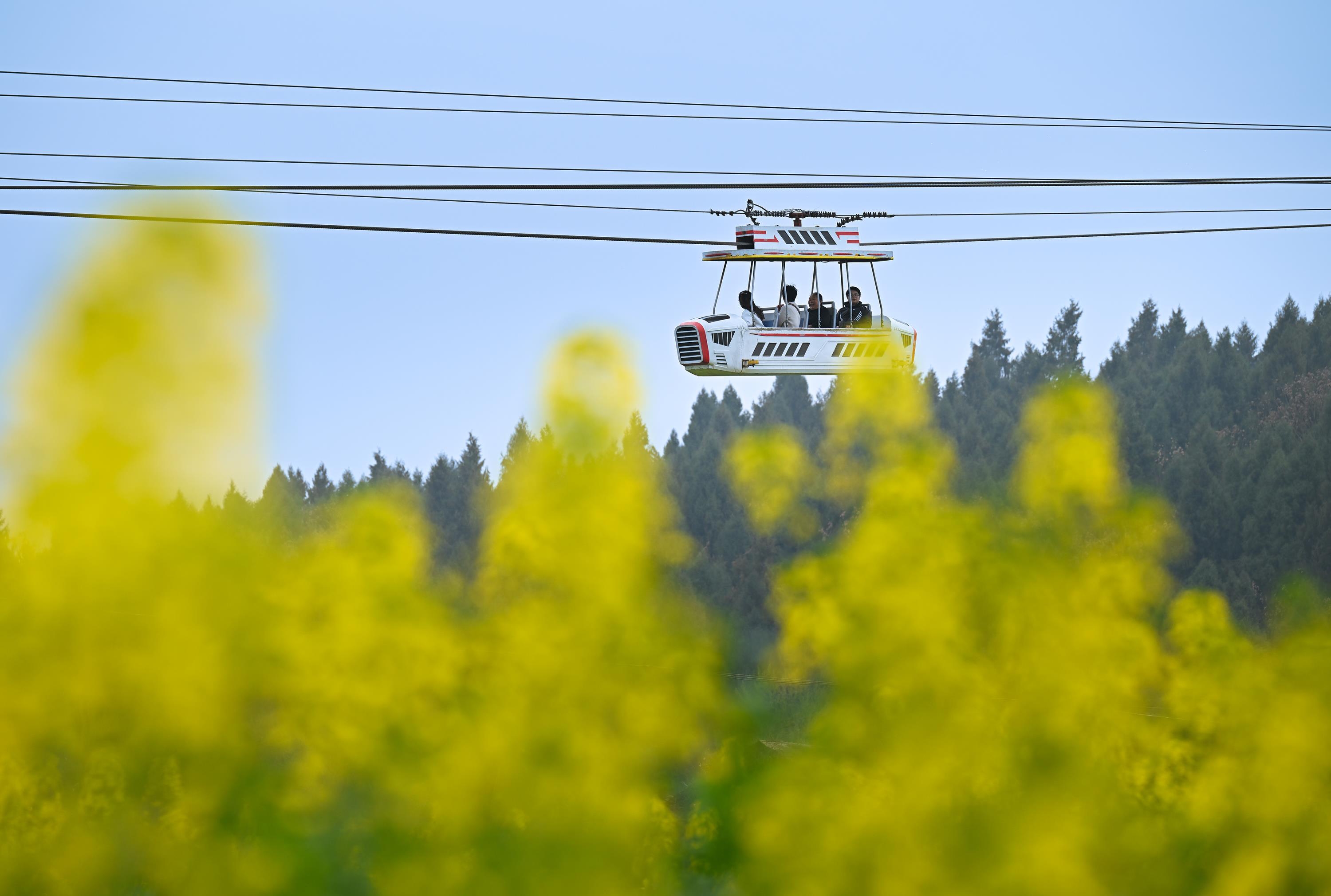 2月27日,潼南区崇龛镇陈抟故里景区,游客们乘坐缆车从油菜花海上经过。记者 张春晓 摄
