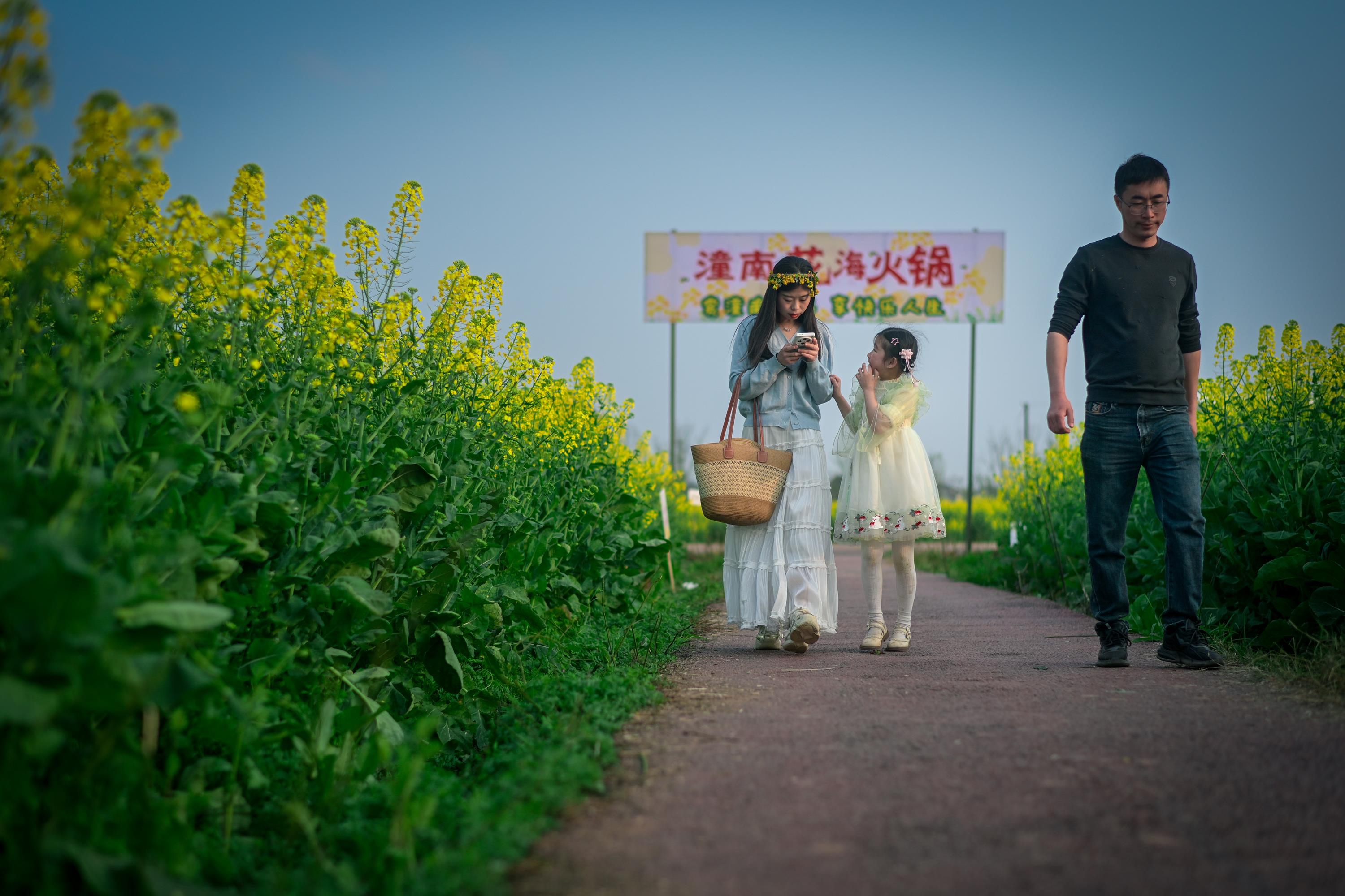 2月27日,潼南区崇龛镇陈抟故里景区,一家人在油菜花地里漫步。记者 张春晓 摄