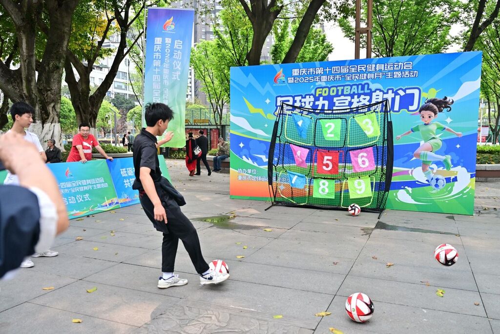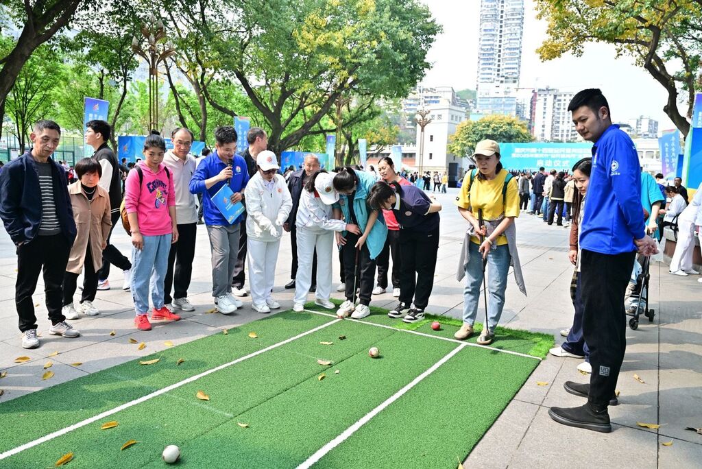 越玩越上头的陆地冰壶、花样百出的定点踢毽、满满“科技范儿”的体感羽毛球VR互动……4月11日上午,500余名体育工作者、健身爱好者和社区群众齐聚大田湾全民健身中心外广场,拉开重庆市第十四届全民健身运动会的序幕,也标志着2025年重庆市“全民健身月”主题活动的正式启动。