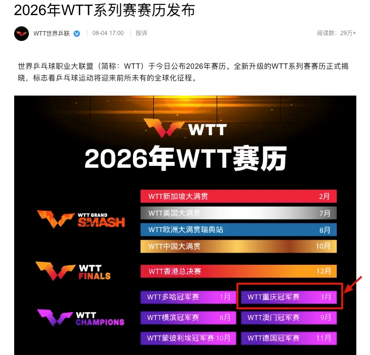 近日,@WTT世界乒联 发布了2026年WTT系列赛赛历。赛历中显示,WTT重庆冠军赛将在2026年3月举办。