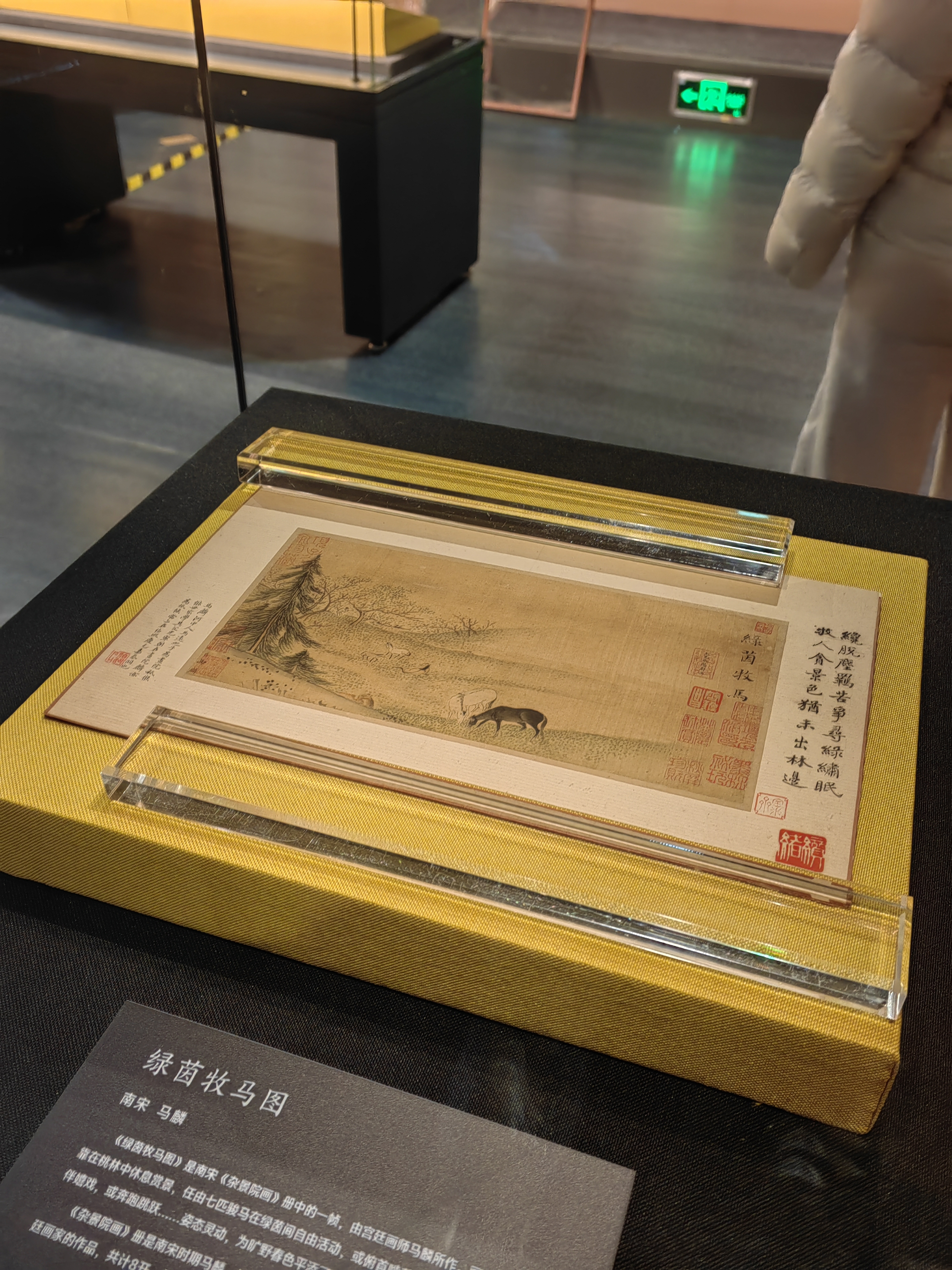 更为珍贵的,是从2月10日展出到3月中旬的一级文物——南宋《绿茵牧马图》,该画出自南宋《杂景院画》册,为宫廷画师马麟所作。画面中,牧马人闲倚桃林,七匹骏马或低头啃草,或回首舔背,或嬉戏奔跑,姿态灵动,绿意盎然,勾勒出一幅生机盎然的春日牧马图。