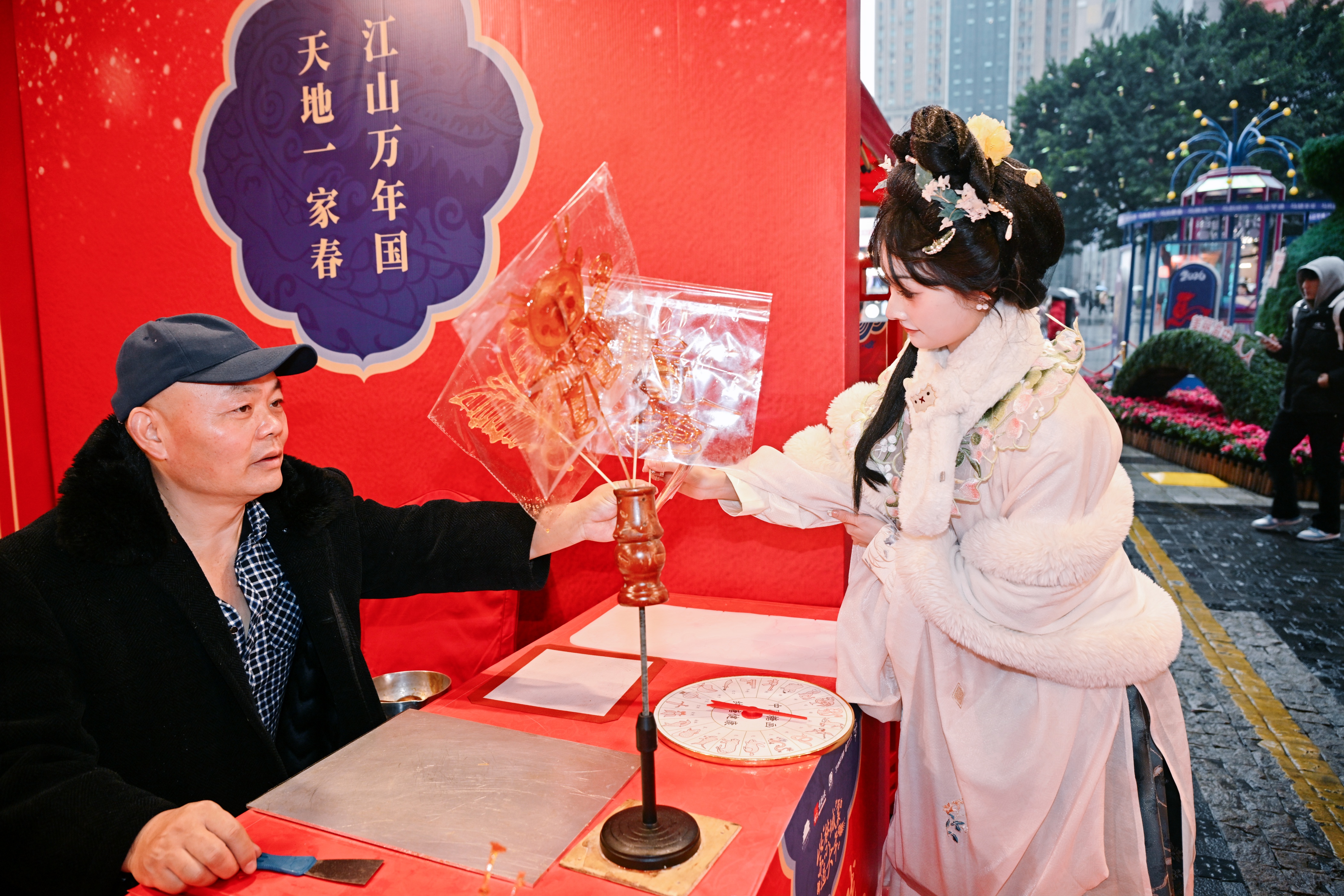 当天,一步入解放碑主会场,浓郁的节庆氛围就扑面而来。错落排布的红墙黄瓦复刻着紫禁城的恢宏规制,与解放碑的现代楼宇相映成趣,形成独特的视觉景观。沿街两侧,剪纸、中国结、烙画等重庆非遗代表性项目琳琅满目,传承人指尖翻飞间,一张张红纸化作寓意吉祥的窗花,让市民在移步换景中触摸本土文化的温度。