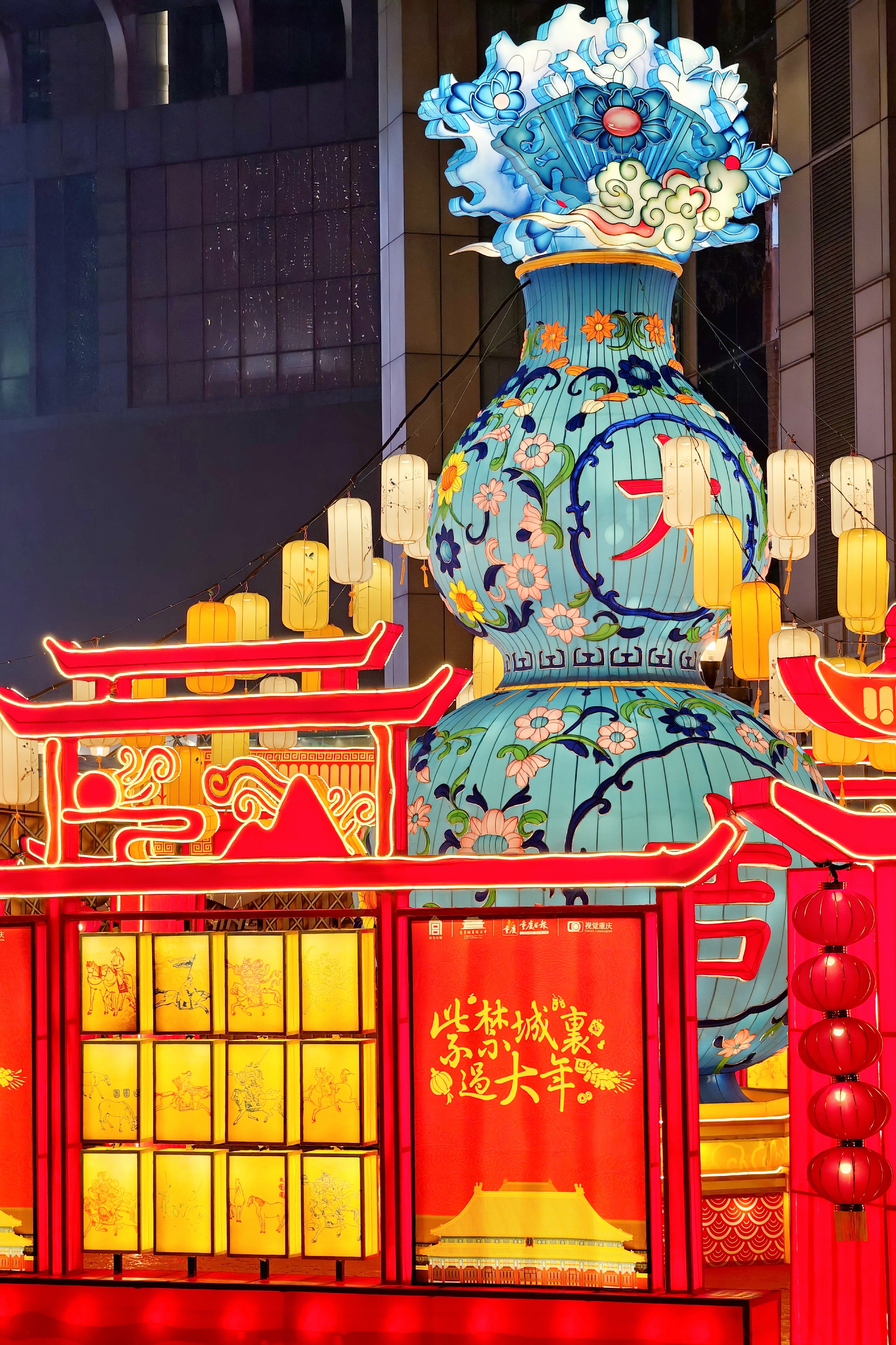 现场最引人瞩目的,当属以故宫馆藏清代紫檀大吉葫芦画挂屏为原型打造的高达8米的“华灯高照”巨型灯组。该灯组由四川省级非遗代表性传承团体核心成员、自贡十佳彩灯工匠陈军团队创作,今年自贡国际恐龙灯会上出圈的“荷荷美美”灯组和“畅想未来”灯组等,都出自陈军团队之手。