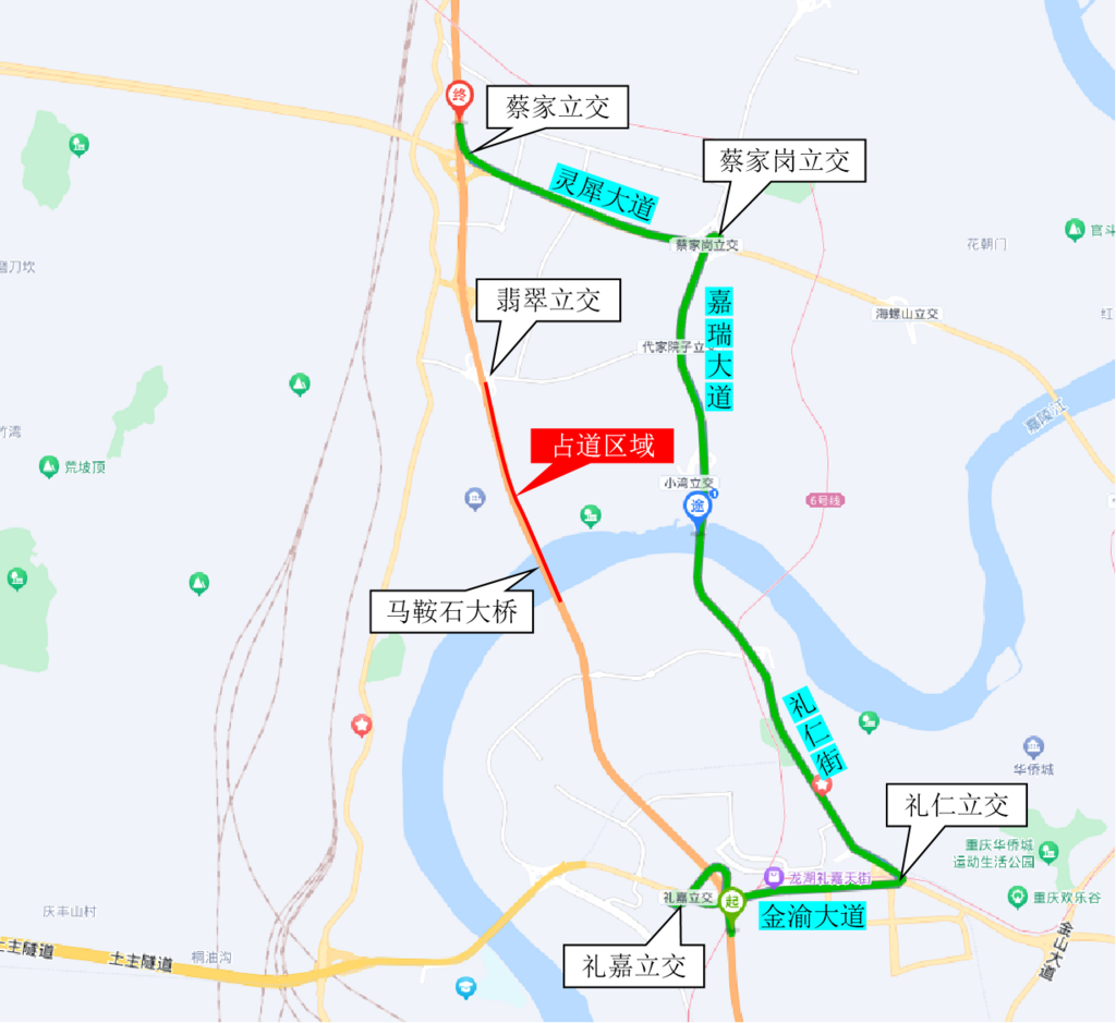 方案一:渝武高速→礼嘉立交→金渝大道→礼仁立交→礼仁街→嘉瑞大道→蔡家岗立交→灵犀大道→蔡家立交→渝武高速