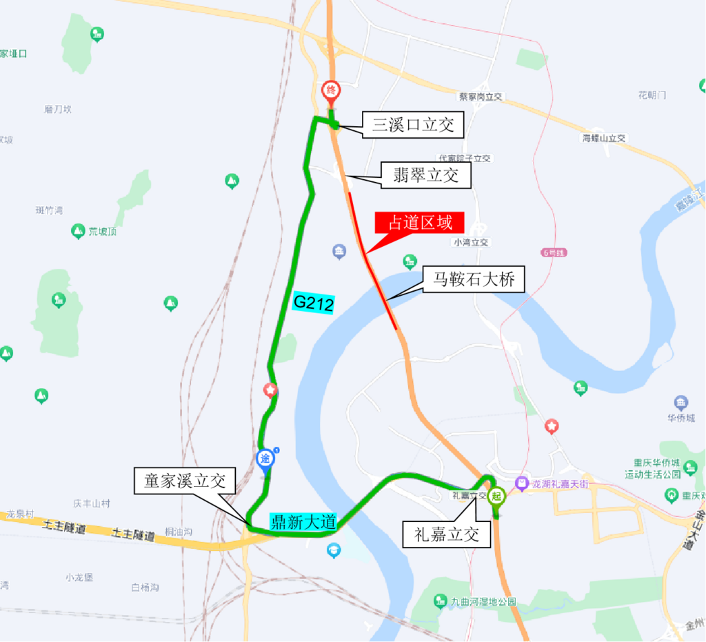 方案二:渝武高速→礼嘉立交→鼎新大道→童家溪立交→G212→三溪口立交→渝武高速
