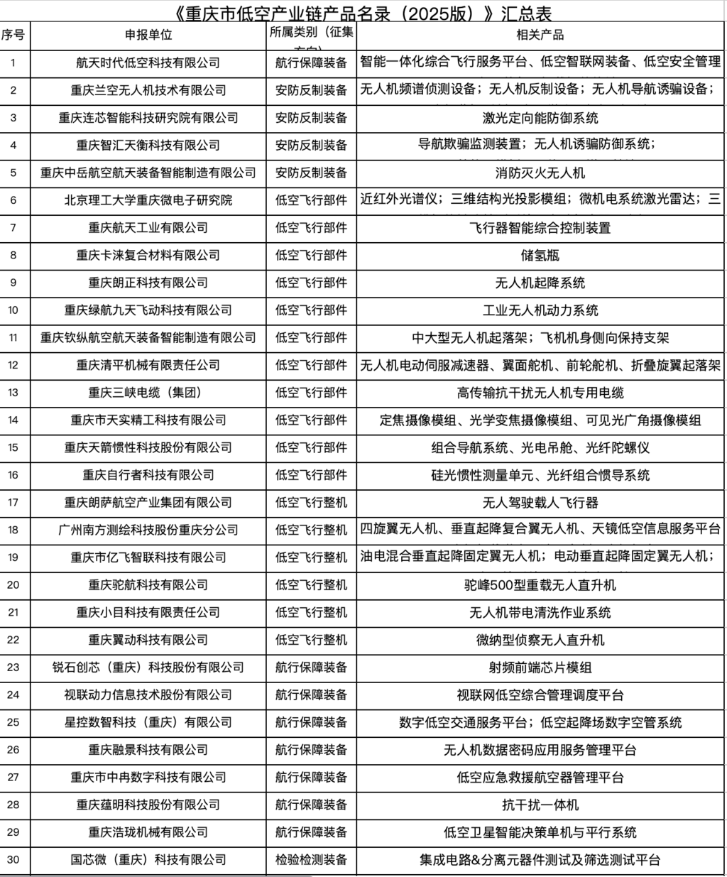 《重庆市低空产业链产品名录(2025年版)》公示。市经济信息委官网截图