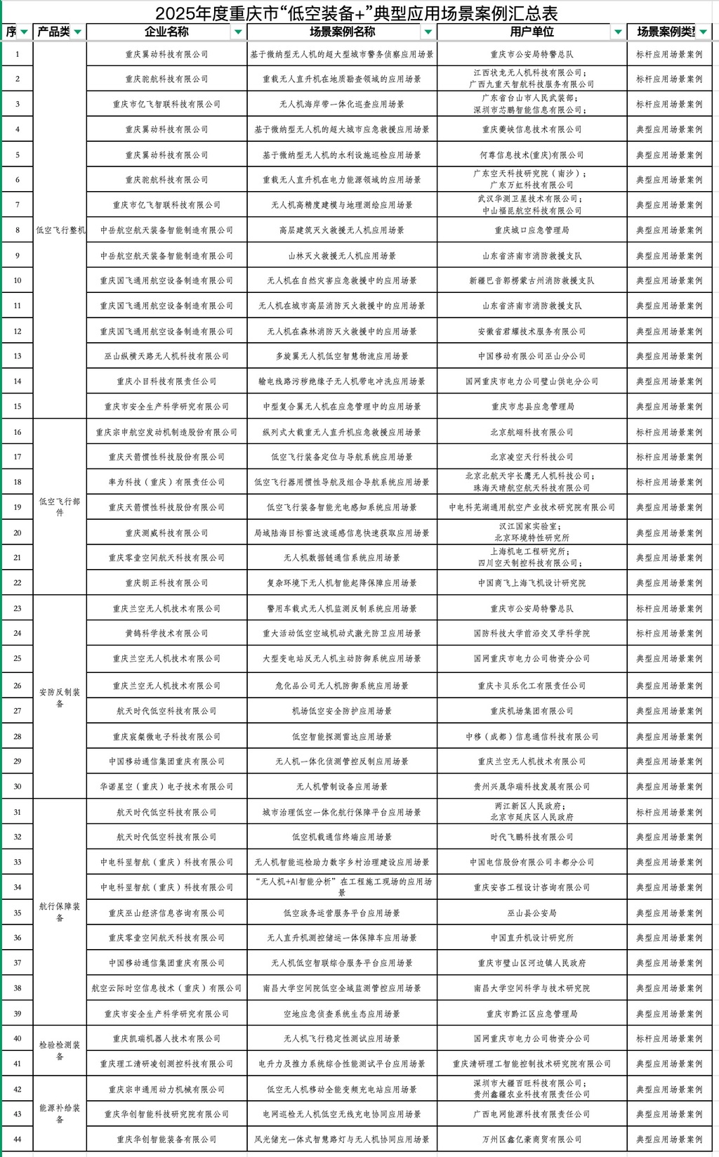 2025年度重庆市“低空装备+”典型应用场景拟入选名单。市经济信息委官网截图