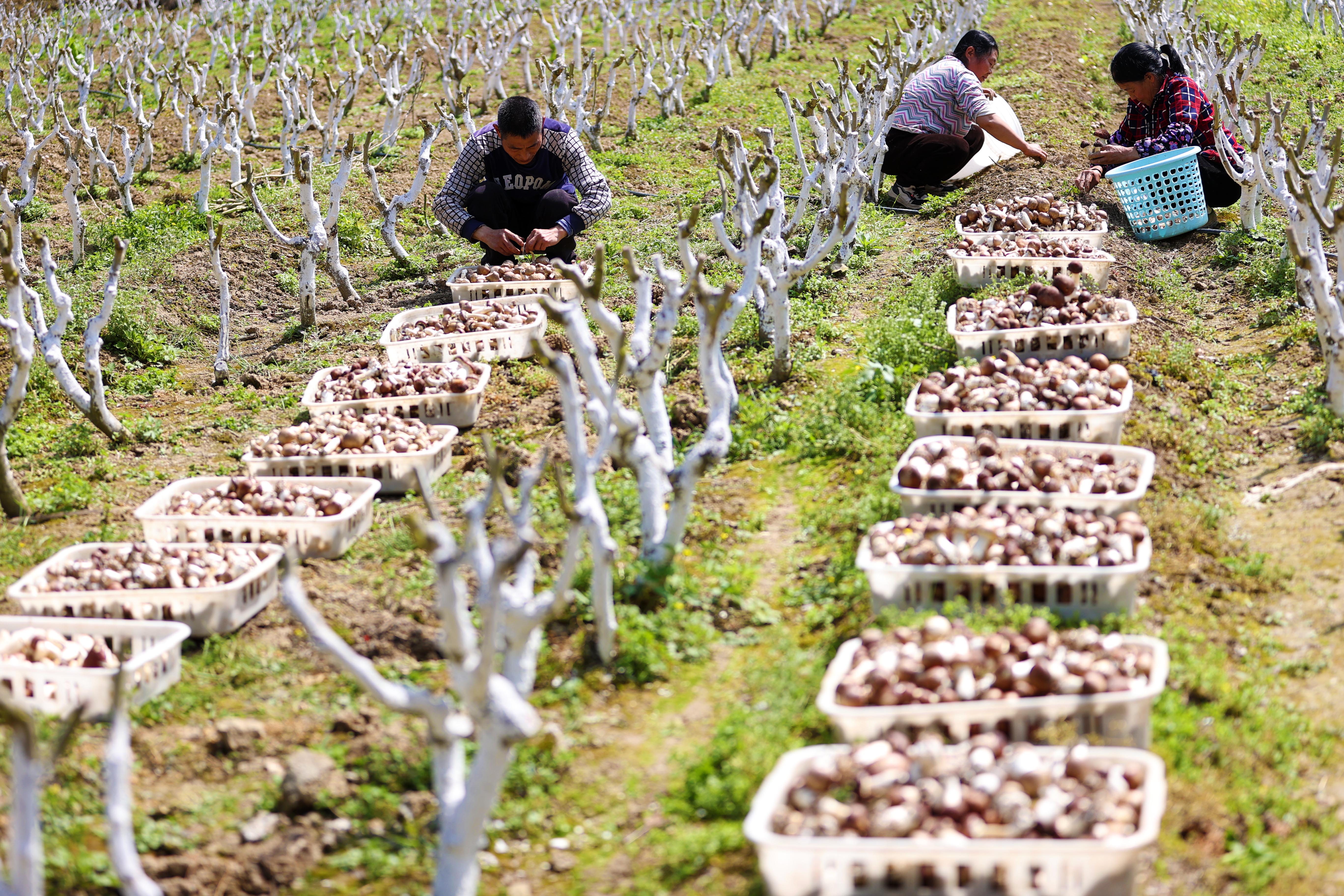 黔江区白石镇中河社区蚕桑基地,村民正在采摘与桑树套种的赤松茸。(资料图片)特约摄影 杨敏