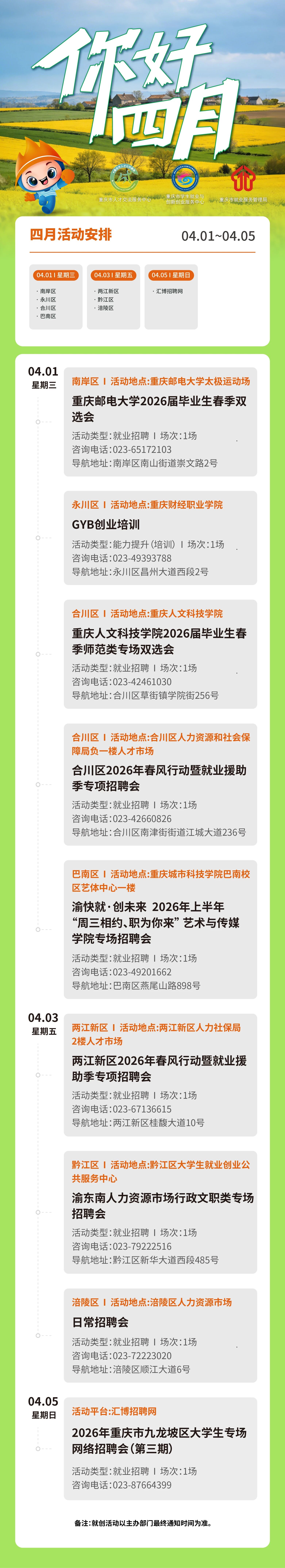 春招正当时,逐梦不止步!本周大学生就业创业活动全面启动,全市共9场大学生就业创业活动,有重庆邮电大学2026届毕业生春季双选会、两江新区2026年春风行动暨就业援助季专项招聘会等。趁春光正好,风华正茂,抓住就业黄金期,告别迷茫焦虑,奔赴职场新赛道,朝着职业梦想全力出发!
