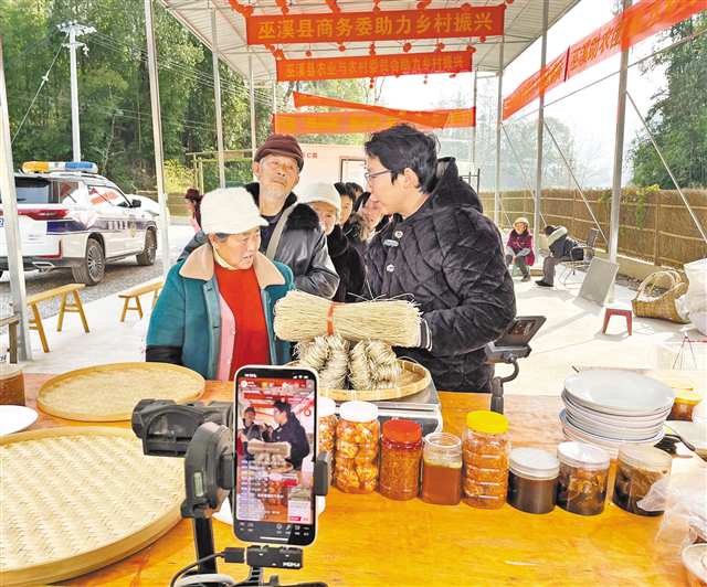 “孃孃们,马上开始直播了,有没得信心把农产品卖完?”“有!大家伙调整好情绪,准备好笑容。”近日,巫溪县塘坊镇富丽塘坊直播基地内,一个个装满辣椒酱、腊肉等土货的背篓整齐摆放,村民们有序排队。随着主播一声吆喝,补光灯亮起,深山里的土特产“通过屏幕”涌向全国网友的餐桌。