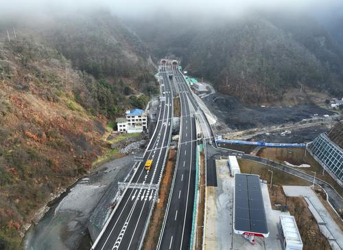 2025年12月25日,重庆城口(陕渝界)至开州高速公路陕渝界至北屏段正式通车,图为,车辆经大巴山隧道进入陕西境内。 记者 罗斌 摄